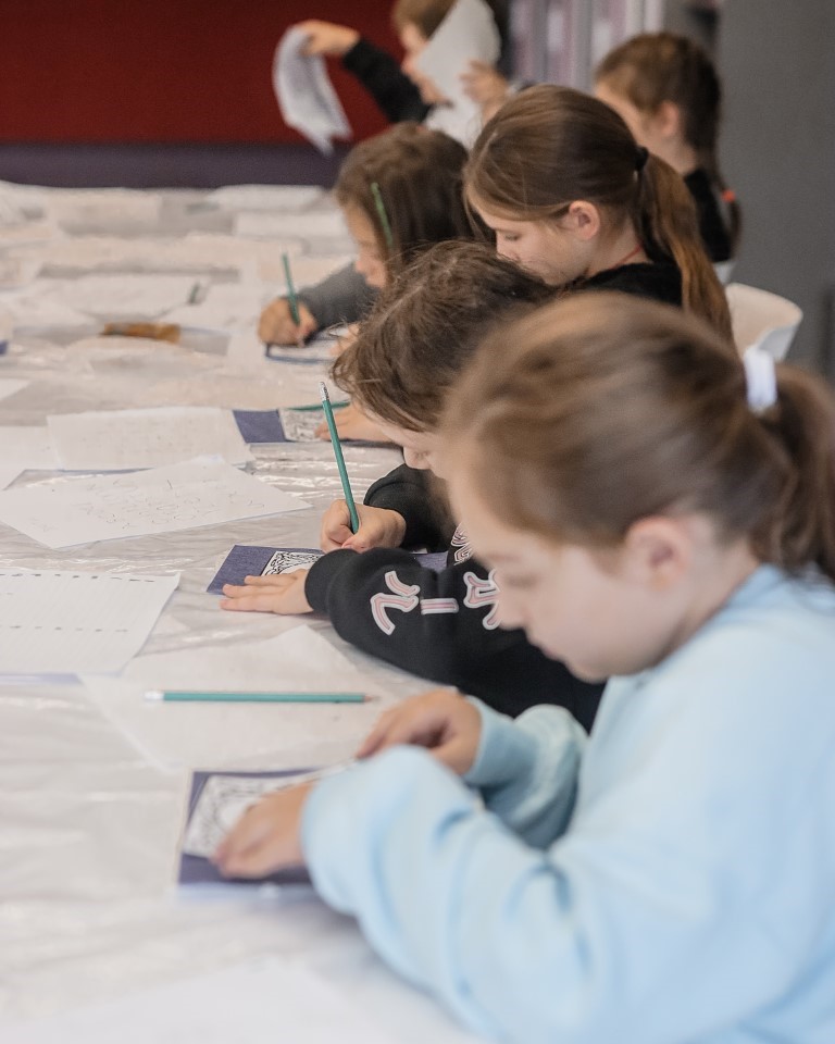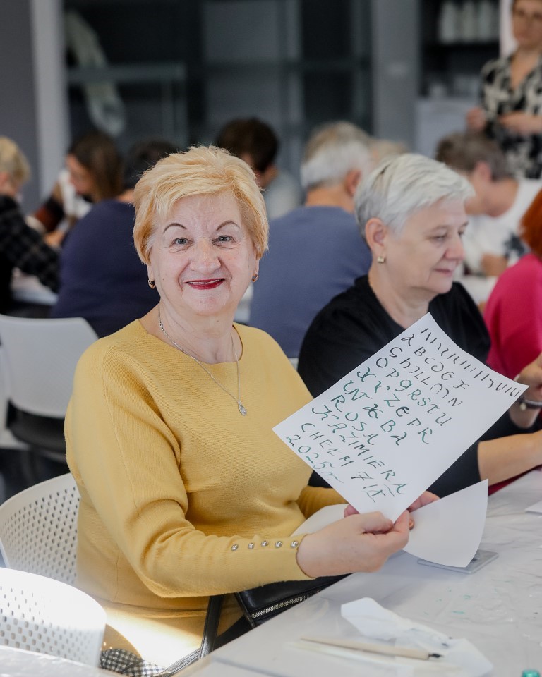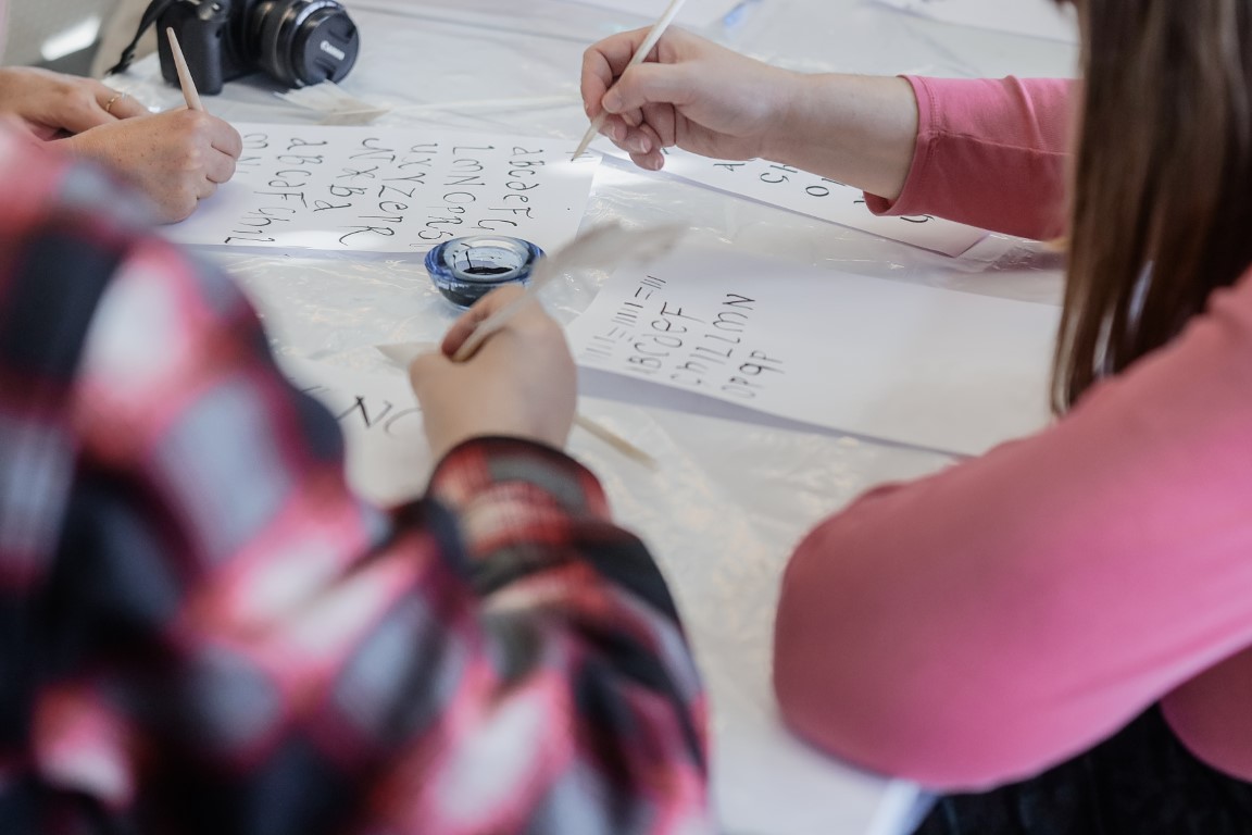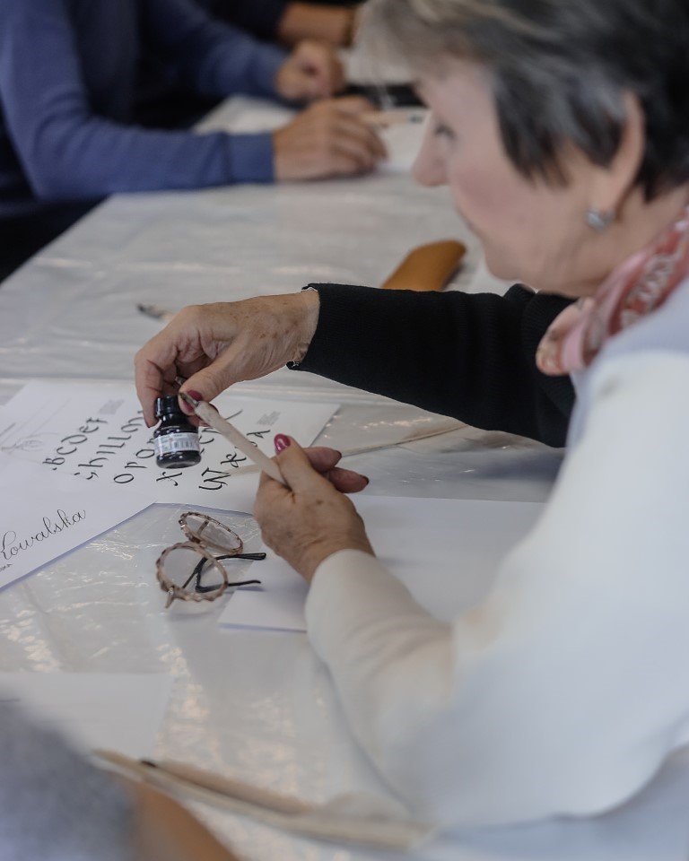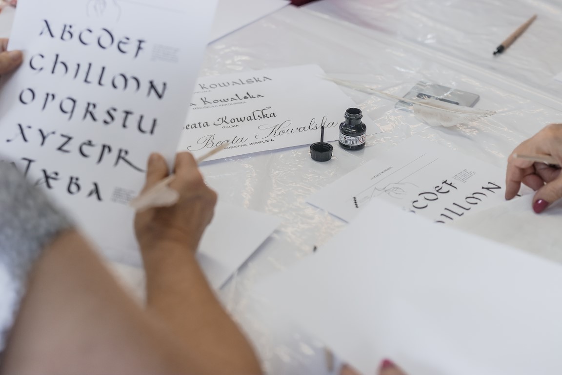 Za nami warsztaty z  kaligrafii i iluminacji dla dzieci i seniorów. Podczas spotkania uczestnicy poznali techniki pisania gęsim piórem, stylizowanym piórkiem maczanym w atramencie, kreślili inicjały oraz zdobili teksty motywami roślinnymi, zwierzęcymi i symbolicznymi. Praca odbywały się na papierze czerpanym, z wykorzystaniem wzorów zaczerpniętych ze średniowiecznych manuskryptów.