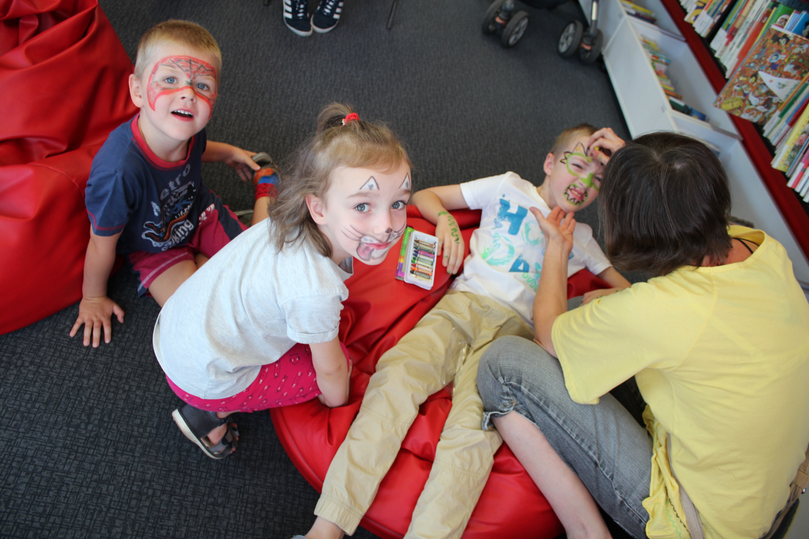 Malowanie twarzy z różnych wzorów i symboli stanowi cześć tradycji wielu kultur. Podczas wakacyjnych zajęć w bibliotece dzieci poznały różne sposoby malowania twarzy stosowane na całym świecie. Wspólnie malowały twarze na kartonach i pozwoliły udekorować swoje buzie różnymi postaciami. Inspiracją do przeprowadzenia spotkania były książki Joyce Coleman i Estelle Videau „Malowanie twarzy”, Anety Kolendo-Borowskiej „Malujemy świat: podręcznik do nauki malowania twarzy” oraz publikacja Jacqeline Russon „Malujemy się”. Dziękujemy za przybycie i zapraszamy na ostatnie wakacyjne warsztaty w środę 29 sierpnia.